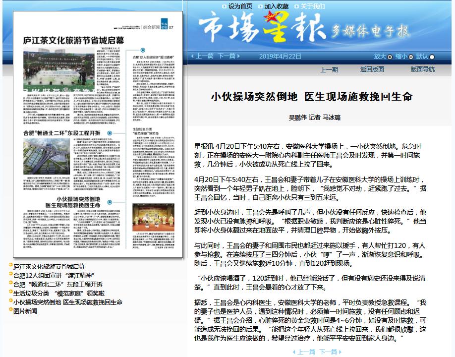 星报讯 4月20日下午5:40左右,安徽医科大学操场上,一小伙突然倒地。危急时刻,正在操场的安医大一附院心内科副主任医师王昌会及时发现,并第一时间施救,几分钟后,小伙被成功从死亡线上拉了回来。