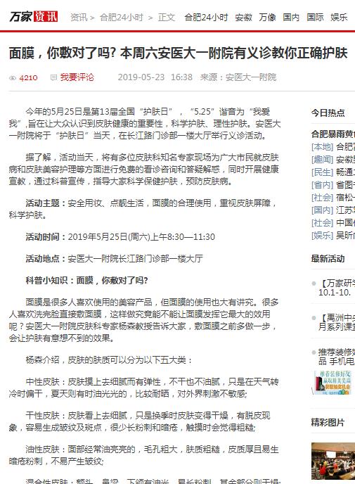 今年的5月25日是第13届全国“护肤日”,“5.25”谐音为“我爱我”,旨在让大众认识到皮肤健康的重要性,科学护肤、理性护肤。安医大一附院将于“护肤日”当天,在长江路门诊部一楼大厅举行义诊活动。据了解,活动当天,将有多位皮肤科知名专家现场为广大市民就皮肤病和皮肤美容护理等方面进行免费的看诊咨询和答疑解惑,同时开展健康宣教,通过科普宣传,指导大家科学保健护肤,预防皮肤病。