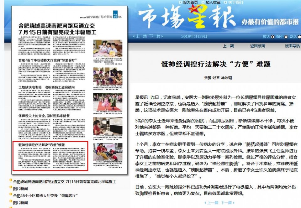 星报讯 昨日,记者获悉,安医大一附院泌尿外科为一位长期尿频且排尿困难的患者实施了骶神经调控疗法,也就是植入“膀胱起搏器”,彻底解决了困扰多年的病痛。据悉,这项技术是安医大一附院率先在省内成功开展,目前已有4位患者获益。