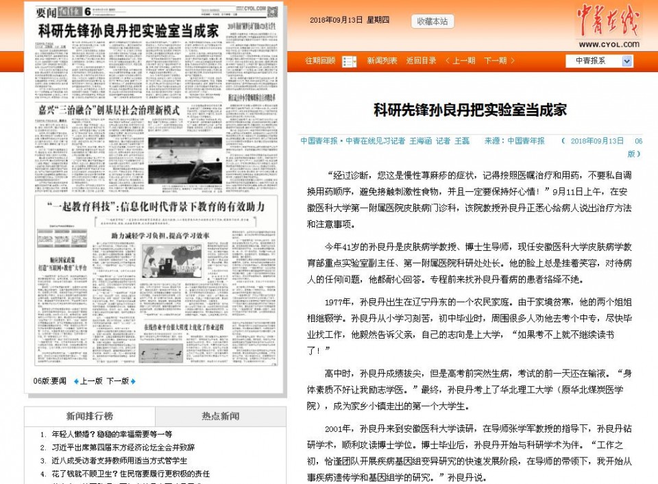 今年41岁的孙良丹是皮肤病学教授、博士生导师,现任安徽医科大学皮肤病学教育部重点实验室副主任、第一附属医院科研处处长。他的脸上总是挂着笑容,对待病人的任何问题,他都耐心回答。专程前来找孙良丹看病的患者络绎不绝。