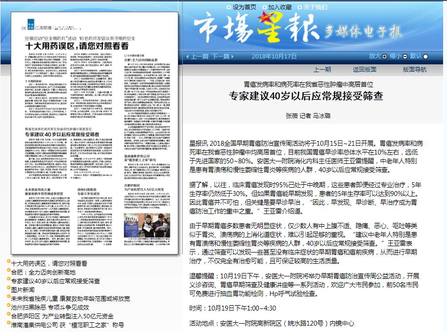 星报讯 2018全国早期胃癌防治宣传周活动将于10月15日~21日开展。胃癌发病率和病死率在我省恶性肿瘤中均高居首位,目前我国胃癌早诊率总体水平在10%左右,远低于先进国家的50~80%。安医大一附院消化内科主任医师王亚雷提醒,中老年人特别是患有胃溃疡和慢性萎缩性胃炎等疾病的人群,40岁以后应常规接受筛查。