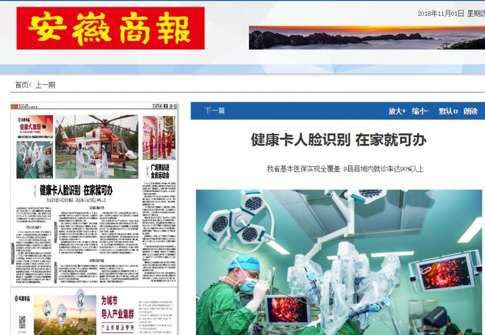 面对“看病难,看病贵”的全国性难题,安徽医疗卫生部门一直在寻求突破。2017年8月20日,我国第一家智慧医院,安徽省立智慧医院正式揭牌。先后投放的7台导医导诊机器人,周服务量超过3万人次;300余台自助设备,日挂号量超过5000笔,这对于日均就诊患者1万余人次的中科大附一院(安徽省立医院)来说,有效的缓解了人手不足的问题,优化了服务,减少了患者等待时间。今年5月4日,该院正式发行全省首张电子健康卡,并成功开发了全国首例基于微信小程序的人脸声纹识别的电子健康卡应用体系。用户拍下身份证上传微信小程序,人脸识别认证后,在家里就能办理电子健康卡。今年年底,将有部分医院接入该系统,带部手机就可全省范围内看病,不用重复检查,还能绑定社保卡,直接线上支付,极大地方便了患者的寻医问诊。安徽省立智慧医院与科大讯飞合作研发了医学影像辅助诊断系统,并推广人工智能语音技术在医护查房、超声检查、口腔门诊等多个场景中应用,同时还构建“云医声”系统及抗菌药物合理使用预警系统。