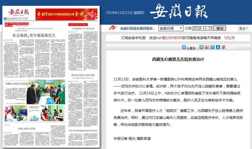11月13日,安徽医科大学第一附属医院心外科病房迎来两名西藏山南地区的患儿——尼玛杰布和次仁卓嘎。经诊断,两个孩子均为先天性心脏畸形患者,需要通过手术进行治疗。 11月14日上午,4岁的次仁卓嘎顺利接受了体外循环下房间隔缺损修补术。另一位患儿尼玛杰布病情较为复杂,医护人员正在为其制定手术方案。 近年来,我省开展医疗人才“组团式”援藏工作,为西藏先天性心脏病患儿提供免费治疗。同时,通过对口支援山南市人民医院,实施远程医疗会诊、人才培养项目等,带动当地医疗服务能力整体提升。