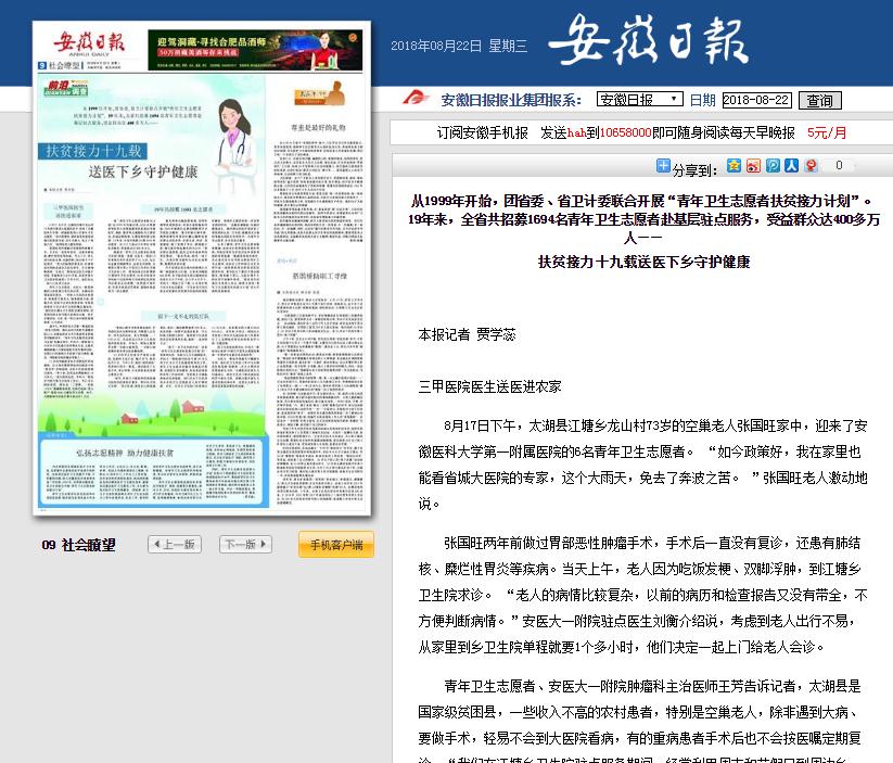 根据省 “青年卫生志愿者扶贫接力计划”的统一部署,安医大一附院19年来派出青年业务骨干92人次,先后在金寨县槐树湾乡、岳西县店前镇、太湖县江塘乡等6个基层卫生单位开展卫生扶贫工作。得知医院正在招募第25期青年卫生志愿者,50多岁的急诊内科副主任医师秦克秀找到医院团委书记黄尧主动请缨,“虽然我不再年轻,但是只要基层有需要,我随时准备再当一回志愿者。 ”