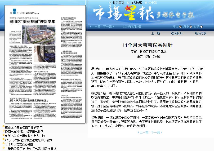 星报讯 一两岁的孩子充满好奇心,什么东西都喜欢放到嘴里尝尝。8月26日夜,安医大一附院接诊了一个11个月大误吞别针的宝宝,幸好及时送医取出。昨日,该院儿科主任医师桂明表示,每年能接诊近百例误吞异物的孩子,其中最常见的食道异物便是硬币,除此之外还有别针、磁铁、电池、拉链头、螺丝钉、戒指、塑料棒、小玩具等,种类五花八门。