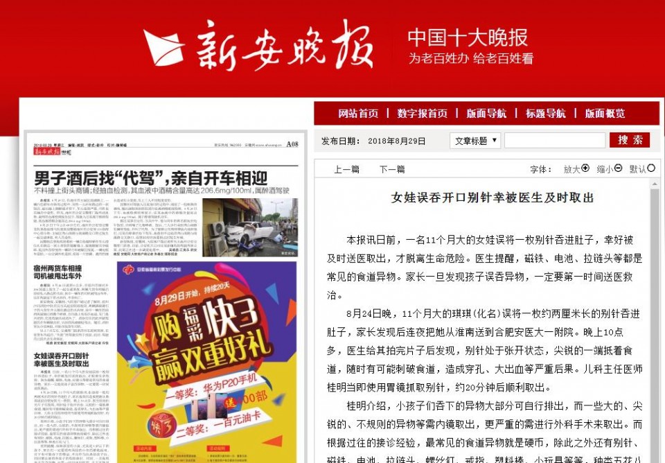8月24日晚,11个月大的琪琪(化名)误将一枚约两厘米长的别针吞进肚子,家长发现后连夜把她从淮南送到合肥安医大一附院。晚上10点多,医生给其拍完片子后发现,别针处于张开状态,尖锐的一端抵着食道,随时有可能刺破食道,造成穿孔、大出血等严重后果。儿科主任医师桂明当即使用胃镜抓取别针,约20分钟后顺利取出。