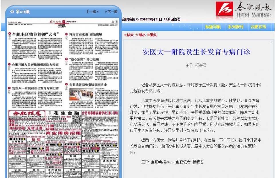 记者从安医大一附院获悉,针对孩子生长发育问题,安医大一附院将于9月起新设专病门诊。