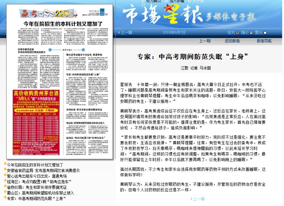 星报讯 十年磨一剑,只待一朝金榜题名,高考大幕今日正式拉开,中考也不远了。睡眠问题是高考期间备受考生和家长关注的话题,昨日,安医大一附院医学心理学科主任黄晓琴提醒,考生中午后忌喝茶和咖啡,以免影响睡眠,“从来没吃过安眠药的考生,不建议服用。”