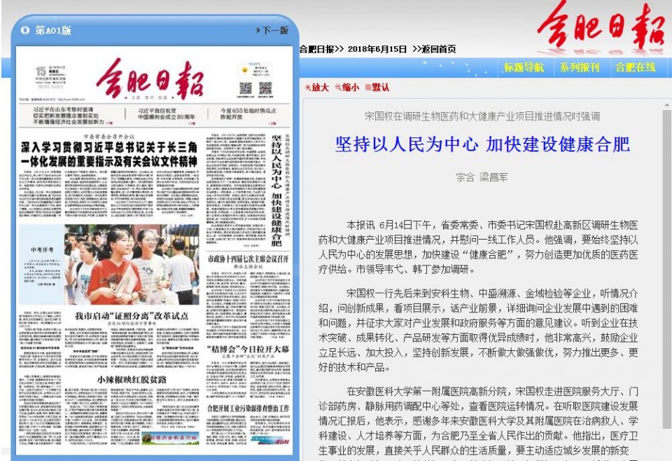 本报讯 6月14日下午,省委常委、市委书记宋国权赴高新区调研生物医药和大健康产业项目推进情况,并慰问一线工作人员。他强调,要始终坚持以人民为中心的发展思想,加快建设“健康合肥”,努力创造更加优质的医药医疗供给。市领导韦弋、韩丁参加调研。
