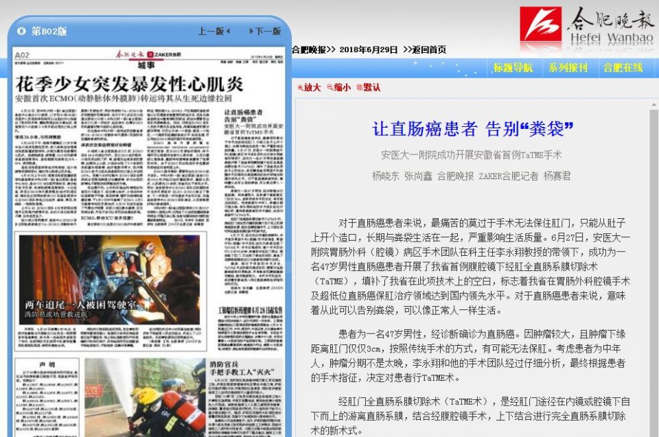 对于直肠癌患者来说,最痛苦的莫过于手术无法保住肛门,只能从肚子上开个造口,长期与粪袋生活在一起,严重影响生活质量。6月27日,安医大一附院胃肠外科(腔镜)病区手术团队在科主任李永翔教授的带领下,成功为一名47岁男性直肠癌患者开展了我省首例腹腔镜下经肛全直肠系膜切除术(TaTME),填补了我省在此项技术上的空白,标志着我省在胃肠外科腔镜手术及超低位直肠癌保肛治疗领域达到国内领先水平。对于直肠癌患者来说,意味着从此可以告别粪袋,可以像正常人一样生活。