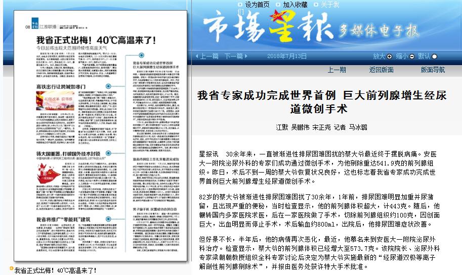 有记录文献表明,目前全世界仅有15例患者的前列腺增生超过500克,但无一例是通过经尿道微创手术治疗的,因此,该手术的成功不仅意味着蔡大爷增生的前列腺腺瘤得到了彻底切除,从解剖学上杜绝了前列腺增生症复发的可能,还标志着我省专家成功完成世界首例巨大前列腺增生经尿道微创手术。目前,蔡大爷各方面生命体征均平稳,病痛解除,恢复状况良好。