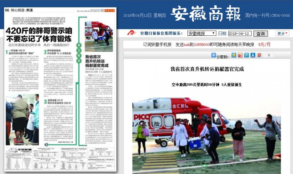 安医一附院器官移植中心主任赵红川表示,大爱捐献者的眼角膜、肾脏、肝脏最起码会让3个人重获新生,1人重见光明。据了解,此次直升机转运器官开启了安徽省器官转运直升机空中飞行的先河。