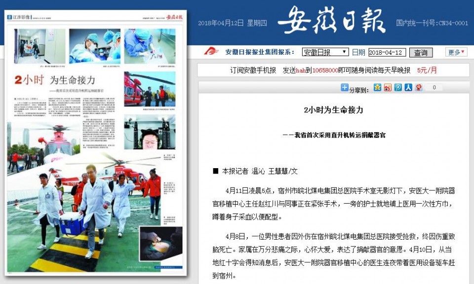 6点05分,医务人员带着一对肝脏和肾脏登上直升机,赵医生在晨曦中勉强合上双眼,闭目养神,等到了合肥,还要进行移植手术。 6点55分,医疗救援直升机稳稳降落在安医大一附院楼顶停机坪,机上医护人员迅速抬下两个器官转运箱,通过快速通道送往手术室。手术室内,3位器官衰竭患者正渴盼着“救命器官”的到来。这是我省首次运用直升机进行器官转运,正如医务人员所说“所有的速度,都是为了成就爱心和希望。 ”