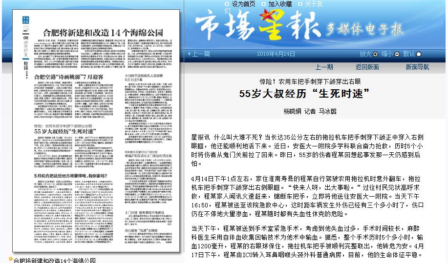 星报讯 什么叫大难不死?当长达35公分左右的拖拉机车把手刺穿下颌正中穿入右侧眼眶,他还能顺利地活下来。近日,安医大一附院多学科联合奋力抢救,历时5个小时将伤者从鬼门关前拉了回来。昨日,55岁的伤者程某回想起事发那一天仍感到后怕。