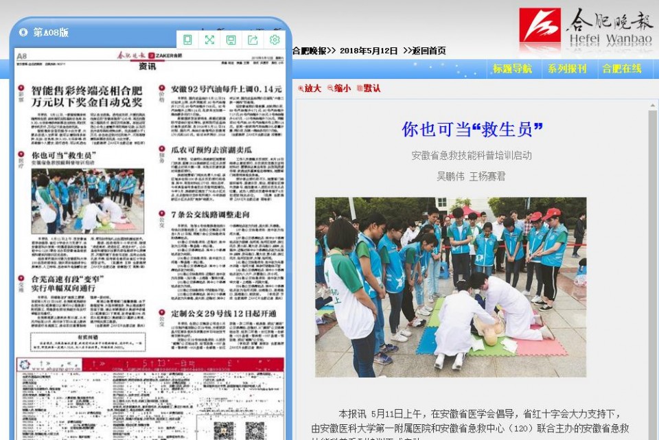 本报讯 5月11日上午,在安徽省医学会倡导,省红十字会大力支持下,由安徽医科大学第一附属医院和安徽省急救中心(120)联合主办的安徽省急救技能科普系列培训正式启动。