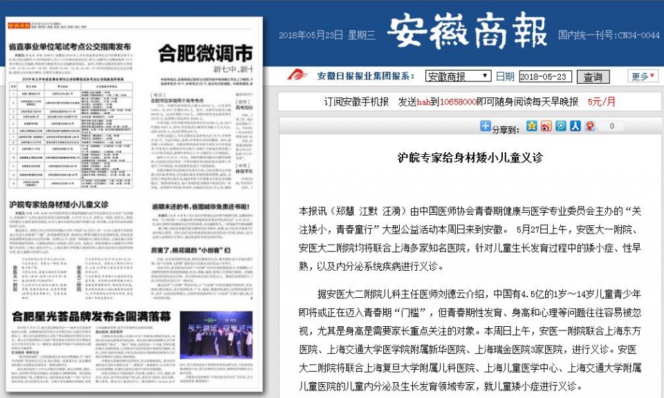 本报讯(郑慧 江默 汪漪)由中国医师协会青春期健康与医学专业委员会主办的“关注矮小,青春童行”大型公益活动本周日来到安徽。 5月27日上午,安医大一附院、安医大二附院均将联合上海多家知名医院,针对儿童生长发育过程中的矮小症、性早熟,以及内分泌系统疾病进行义诊。