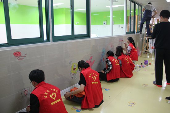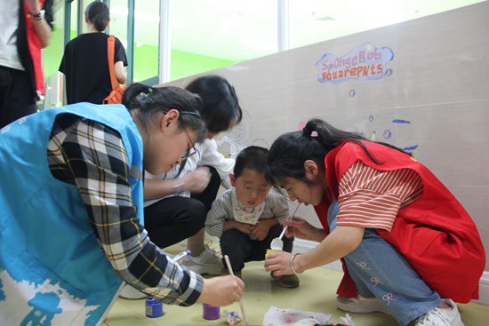 现场,在康复老师的带领下,小朋友尽力完成每一个动作,虽然有些吃力,有时会跟不上节奏,但是他们表现出了极大地兴趣和热情。联欢会后,志愿者们还领着小朋友们在病房的墙上进行彩绘创作,一起捏橡皮泥,在游戏中锻炼动手能力。