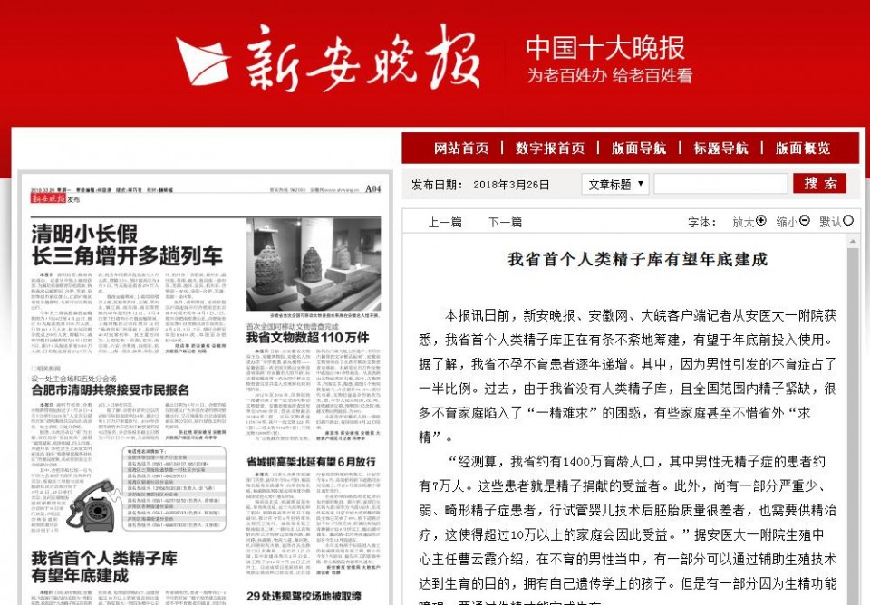 本报讯日前,新安晚报、安徽网、大皖客户端记者从安医大一附院获悉,我省首个人类精子库正在有条不紊地筹建,有望于年底前投入使用。据了解,我省不孕不育患者逐年递增。其中,因为男性引发的不育症占了一半比例。过去,由于我省没有人类精子库,且全国范围内精子紧缺,很多不育家庭陷入了“一精难求”的困惑,有些家庭甚至不惜省外“求精”。