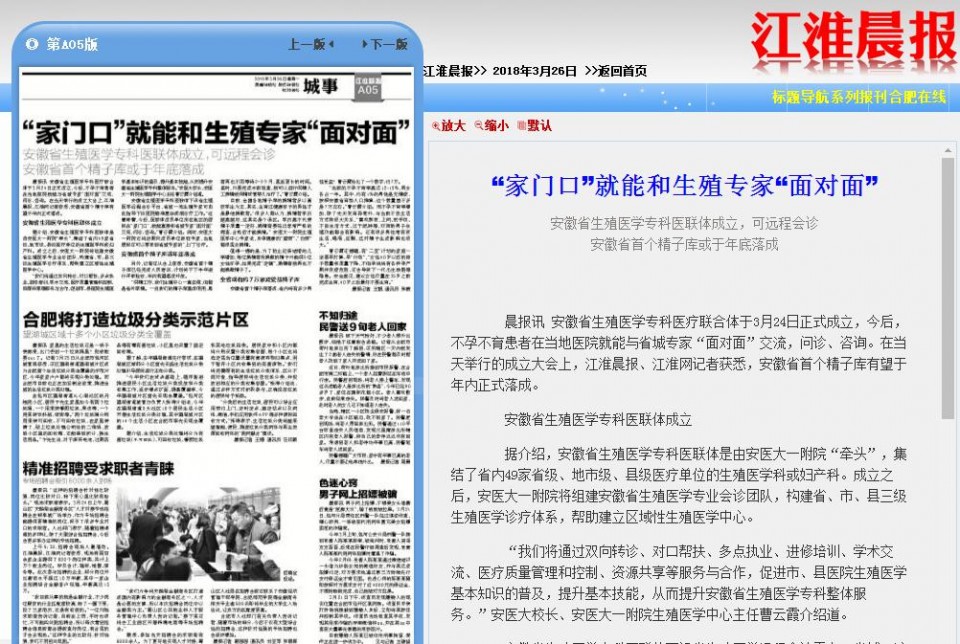 晨报讯 安徽省生殖医学专科医疗联合体于3月24日正式成立,今后,不孕不育患者在当地医院就能与省城专家“面对面”交流,问诊、咨询。在当天举行的成立大会上,江淮晨报、江淮网记者获悉,安徽省首个精子库有望于年内正式落成。