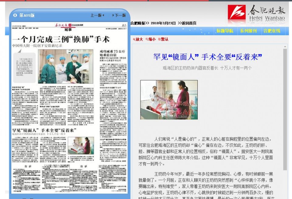 人们常说“人是偏心的”,正常人的心脏在胸腔里的位置偏向左边,可家住合肥瑶海区的王奶奶却“偏心”偏在右边,不仅如此,王奶奶的肝、胆、脾等器官全都和正常人的位置相反,俗称“镜面人”。据安医大一附院高新院区心内科主任医师陈大年介绍,这种“镜面人”非常罕见,十万个人里面才有一到两个。