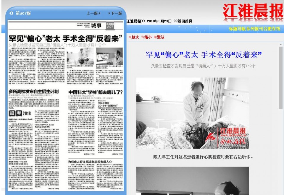 “‘镜面人’是一种罕见的先天性畸形,胸腔、腹腔器官位置和解剖结构都长反了,也就是说心脏和脾脏在右边、肝脏位于左边,好像是正常脏器的镜面像。”安医大一附院高新院区心内科主任医师陈大年介绍,虽然“镜面人”的内脏全部错位,但相互间的关系并未改变,因此生理功能与正常人一样。不过,相对而言,“右心脏”的人更容易发生心脏问题。比如王奶奶,检查结果还显示其心律不齐,心跳快的时候能达到一分钟两百多次,慢的时候才三四十次,甚至还出现多次窦性停搏,最长的一次心脏停跳达7秒,“这是病态窦房结综合症,最佳的治疗方案是植入永久性心脏双腔起搏器。”