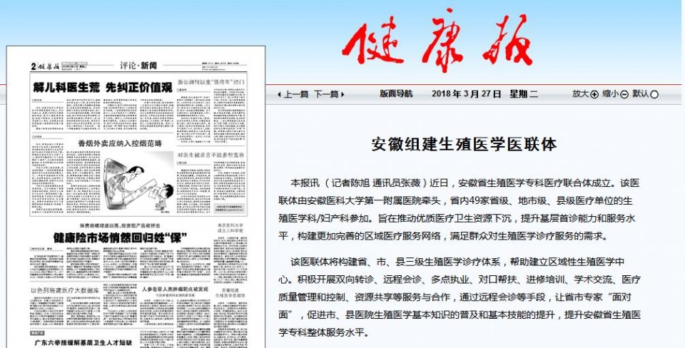 本报讯 (记者陈旭 通讯员张薇)近日,安徽省生殖医学专科医疗联合体成立。该医联体由安徽医科大学第一附属医院牵头,省内49家省级、地市级、县级医疗单位的生殖医学科/妇产科参加。旨在推动优质医疗卫生资源下沉,提升基层首诊能力和服务水平,构建更加完善的区域医疗服务网络,满足群众对生殖医学诊疗服务的需求。