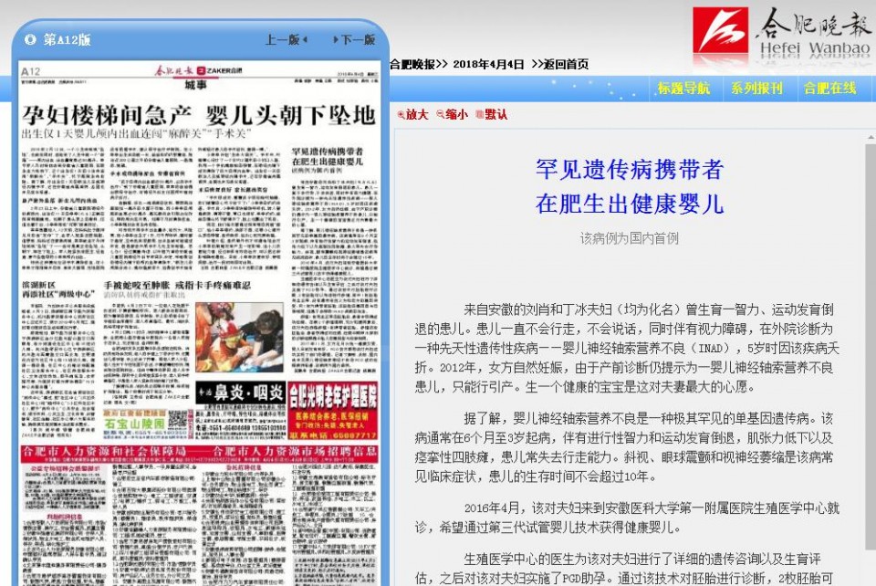 来自安徽的刘肖和丁冰夫妇(均为化名)曾生育一智力、运动发育倒退的患儿。患儿一直不会行走,不会说话,同时伴有视力障碍,在外院诊断为一种先天性遗传性疾病——婴儿神经轴索营养不良(INAD),5岁时因该疾病夭折。2012年,女方自然妊娠,由于产前诊断仍提示为一婴儿神经轴索营养不良患儿,只能行引产。生一个健康的宝宝是这对夫妻最大的心愿。