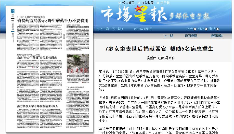 星报讯 4月2日23时许,来自安徽省灵璧县的7岁女童莹莹(化名)离开了人世。15分钟后,莹莹的器官捐献手术在安医大一附院手术室完成。莹莹用另一种方式帮助了5名深受疾病折磨的病患。来自灵璧县一户普通农家的莹莹在三岁半时,被确诊为I型糖尿病。虽然几年间辗转了多家医院,经过不断治疗,但病情却一直未见好转。