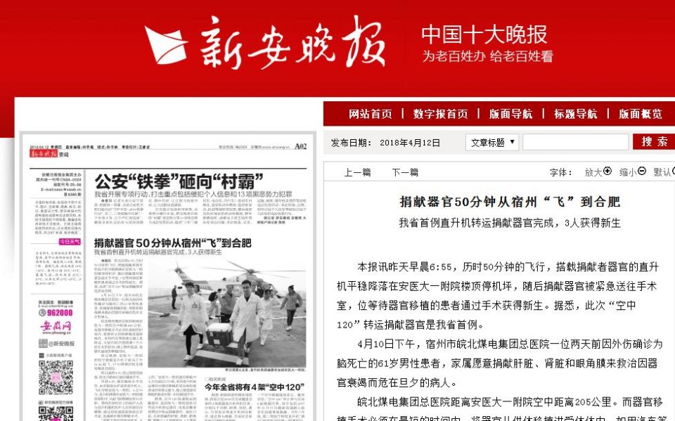 早晨6:05,器官摘取手术完毕,由专职医生护送至直升机上,飞往合肥安医大一附院。6点55分,直升机降落在安医大一附院楼顶停机坪,从起飞到降落仅用50分钟。等待在停机坪上的医护人员与直升机随机医护人员将器官冷藏箱,通过绿色通道直接送达手术室,迅速展开器官移植手术。