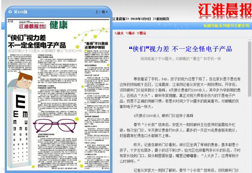 寒假看紧了手机、PAD,孩子的视力还是下降了,各位家长是不是也有这样的烦恼呢?近日,江淮晨报、江淮网记者从安医大一附院得知,开学后,该院眼科门诊迎来就诊小高峰,4天接诊患者约2200余人,其中多为学龄期的患儿,近视占“大头”。眼科专家提醒,真正对视力具有杀伤力的不是电子产品,而是不正确的用眼习惯。若是长时间少于33厘米的距离看书,对眼睛的伤害和电子产品一样大。 4天接诊2200余人 眼科门诊迎来小高峰