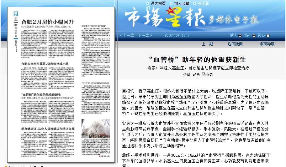 星报讯 得了高血压,很多人觉得不是什么大病,吃点降压药维持一下就可以了。但近日,阜阳的高先生却因为高血压险些丢了性命,医生诊断他是先天性的主动脉缩窄,心脏的降主动脉被血栓“堵死”了,引发了心脏肾脏衰竭。为了保证血流畅通,安医大一附院的医生在高先生的升主动脉和腹主动脉之间架设了一条“血管桥”,现在高先生已经顺利康复,高血压症状也消失了。