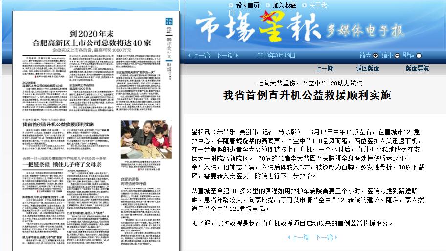 星报讯(朱昌乐 吴鹏伟 记者 马冰璐) 3月17日中午11点左右,在宣城市120急救中心,伴随着螺旋桨的轰鸣声,“空中”120卷风而落,两位医护人员迅速下机,在一旁等候的患者李大爷随即被接上直升机,一个小时后,直升机平稳地降落在安医大一附院高新院区。 70岁的患者李大爷因“头胸腹全身多处摔伤昏迷1小时余”入院,他神志不清,入院后即转入ICU,被诊断为血胸,多发性骨折,T8以下截瘫,需要转入安医大一附院进行下一步救治。从宣城至合肥200多公里的路程如用救护车转院需要三个小时,医院考虑到路途颠簸、患者年龄较大,向家属提出了可以申请“空中”120转院的建议。随后,家人拨通了“空中”120救援电话。
