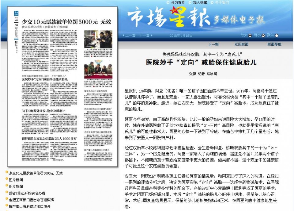 星报讯 13年前,阿夏(化名)唯一的孩子因白血病不幸去世。2017年,阿夏终于通过试管婴儿怀孕了,而且是双胎,一家人喜出望外,可喜悦很快被“其中一个孩子是唐氏儿”的坏消息冲散。最近,她在安医大一附院接受了“定向”减胎术,成功地保住了健康的胎儿。