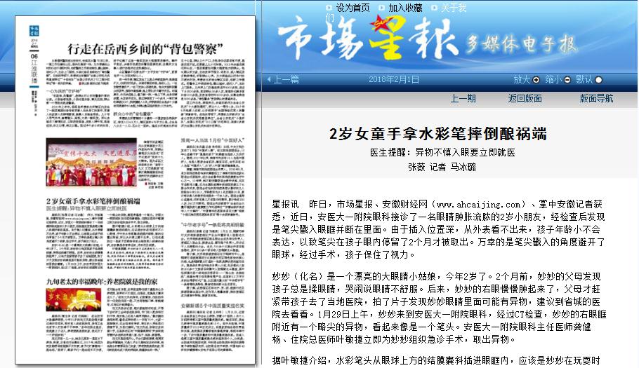 星报讯 昨日,市场星报、安徽财经网(www.ahcaijing.com)、掌中安徽记者获悉,近日,安医大一附院眼科接诊了一名眼睛肿胀流脓的2岁小朋友,经检查后发现是笔尖戳入眼眶并断在里面。由于插入位置深,从外表看不出来,孩子年龄小不会表达,以致笔尖在孩子眼内停留了2个月才被取出。万幸的是笔尖戳入的角度避开了眼球,经过手术,孩子保住了视力。