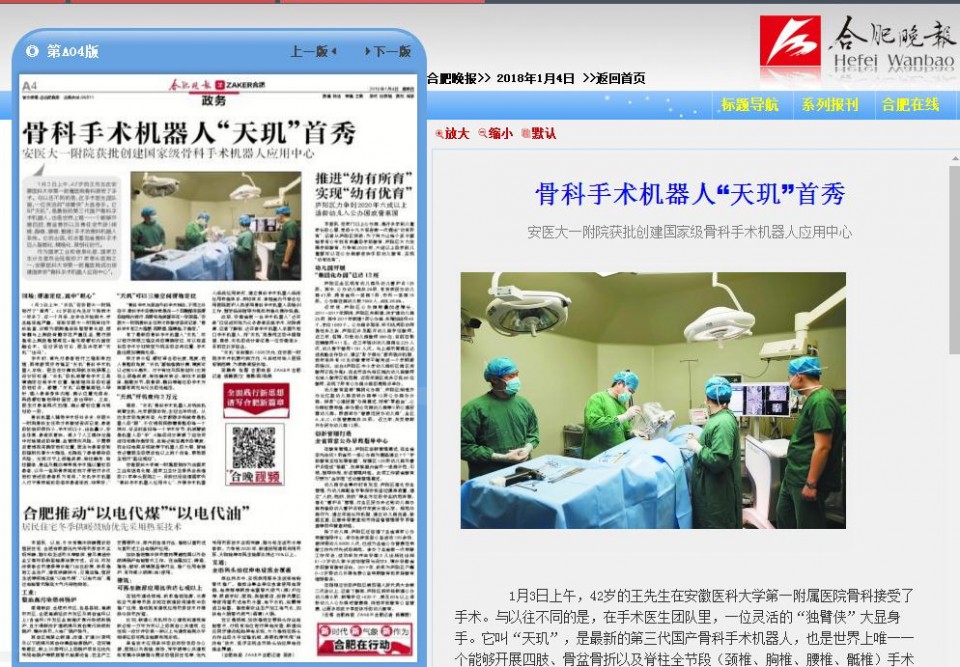 作为国家工业和信息化部、国家卫生计生委员会批准的21家牵头医院之一,安徽医科大学第一附属医院成功创建国家级“骨科手术机器人应用中心”。