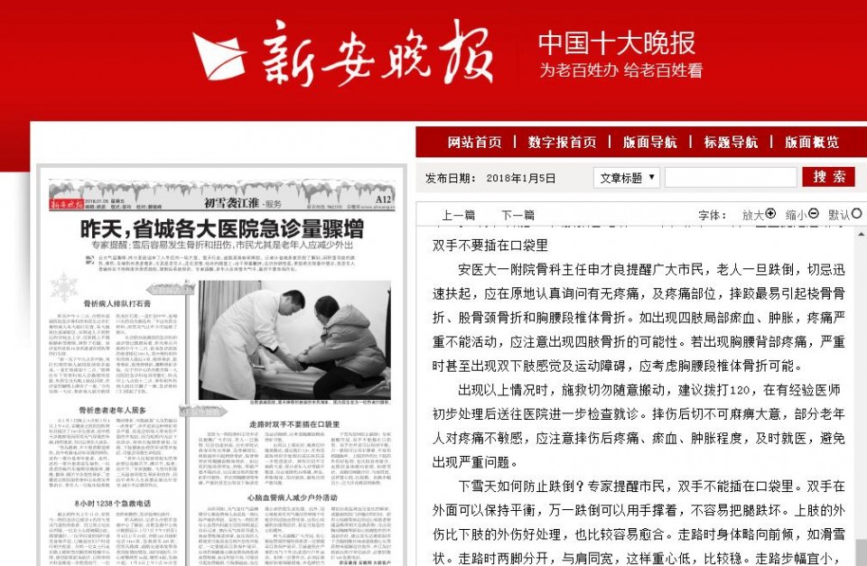 安医大一附院骨科主任申才良提醒广大市民,老人一旦跌倒,切忌迅速扶起,应在原地认真询问有无疼痛,及疼痛部位,摔跤最易引起桡骨骨折、股骨颈骨折和胸腰段椎体骨折。如出现四肢局部瘀血、肿胀,疼痛严重不能活动,应注意出现四肢骨折的可能性。若出现胸腰背部疼痛,严重时甚至出现双下肢感觉及运动障碍,应考虑胸腰段椎体骨折可能。