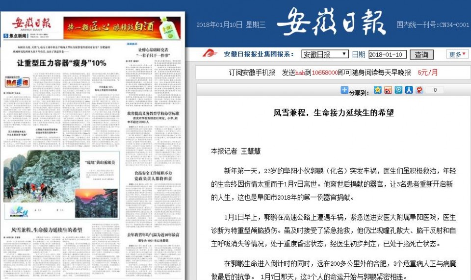 据了解,2017年,安医大一附院共完成人体器官捐献23例,肾移植108例,肝移植11例。