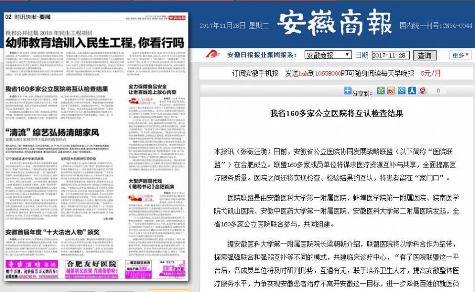 本报讯(张薇汪漪)日前,安徽省公立医院协同发展战略联盟(以下简称“医院联盟”)在合肥成立。联盟160多家成员单位将谋求医疗资源互补与共享,全面提高医疗服务质量。医院之间还将实现检查、检验结果的互认,将患者留在“家门口”。
