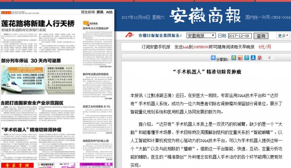 本报讯(江默凌颖汪漪)近日,在安医大一附院,专家运用IQQA技术平台和“达芬奇”手术机器人系统,成功为一位六旬患者切除右肾肿瘤并保留部分肾单位,展示了智能量化规划系统和医用机器人协同发展的新方向。