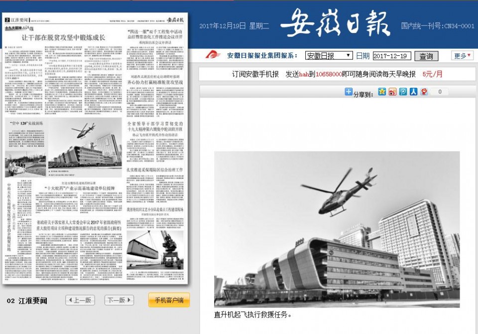 12月18日,安医大一附院高新院区停机坪上,医护人员将救援直升机上的“重伤员”迅速送往急诊中心进行抢救。当日,由省卫计委、省政府应急办主办的2017安徽省直升机空中医疗救援演练在该院举行。演练包含信息报告、应急联动、现场处置、空中救援和院内急救,全方位模拟从事故发生到救援完成的全过程。同时,我省首个直升机医疗救援基地医院落户安医大一附院。 本报记者 程兆 摄影报道