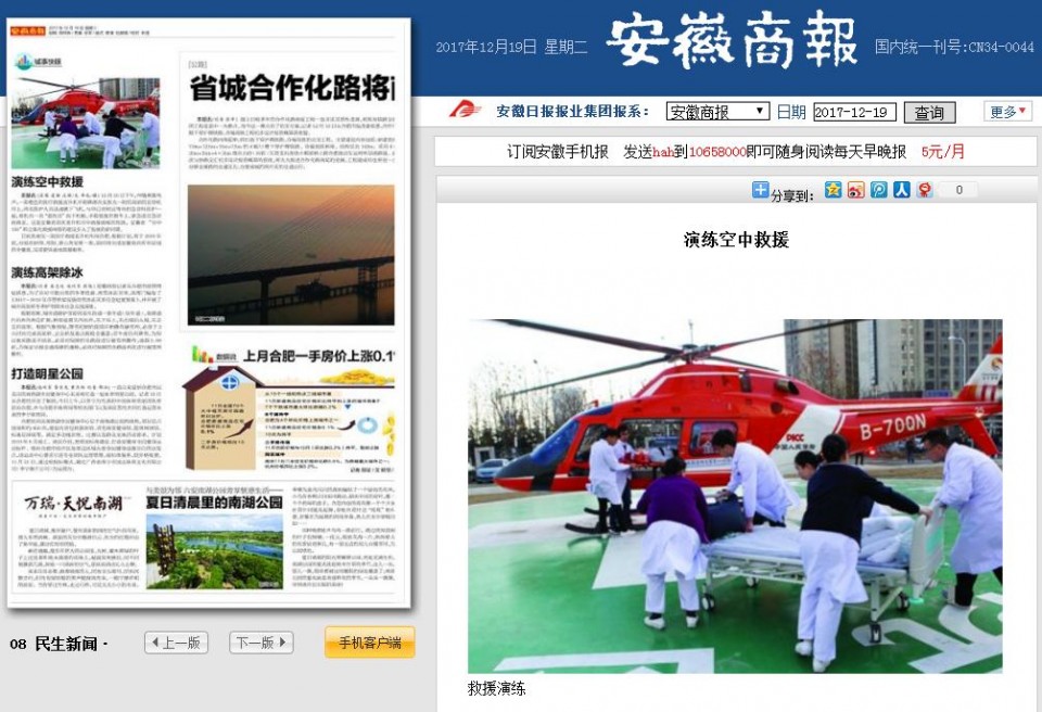 本报讯(张薇 凌颖 汪漪/文 卓也/摄)12月18日下午,伴随着轰鸣声,一架橙色的医疗救援直升机平稳降落在安医大一附院高新院区停机坪上,两名医护人员迅速跳下飞机,与早已在附近等待的急诊科医护一起,将机内一名“重伤员”抬下机舱,平稳放置在推车上,紧急送往急诊抢救室。这是安徽省首次直升机空中救援演练的现场,安徽省“空中120”和立体化救援网络的建设步入了发展的新时期。