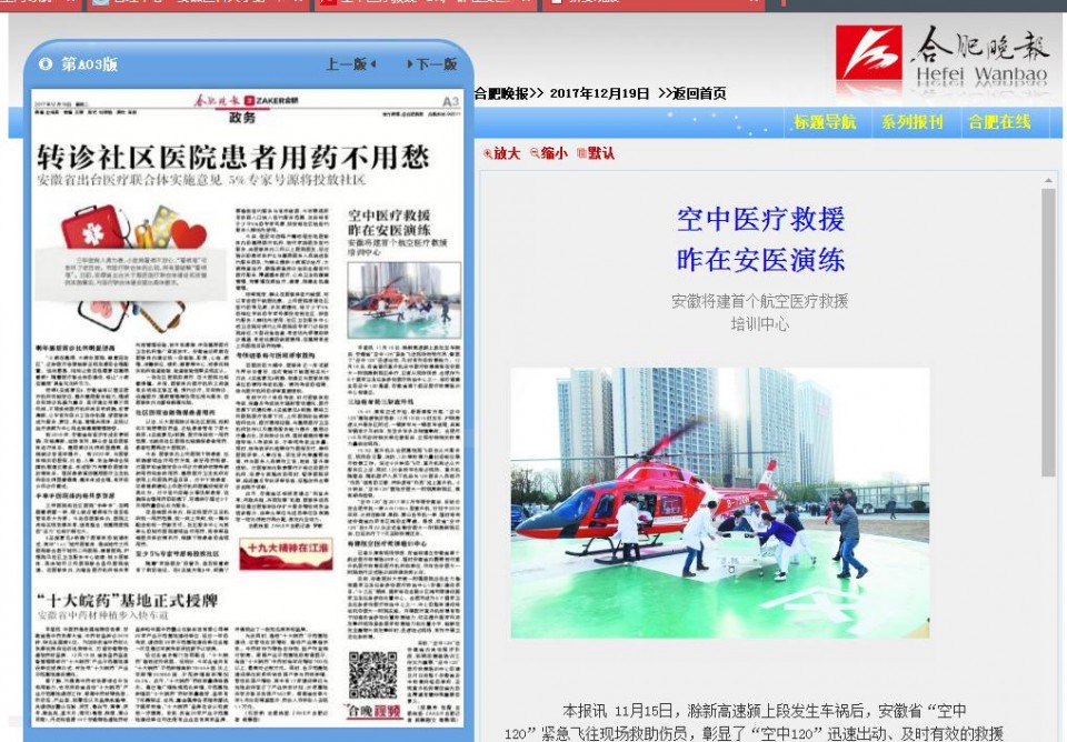 本报讯 11月15日,滁新高速颍上段发生车祸后,安徽省“空中120”紧急飞往现场救助伤员,彰显了“空中120”迅速出动、及时有效的救援能力。12月18日,我省首次直升机空中医疗救援演练在安医大一附院高新院区举行,记者从现场获悉,合肥作为6个国家卫生应急移动医疗救治中心之一,将打造健全的空中120通道,安徽省首个航空医疗救援培训中心将建立。