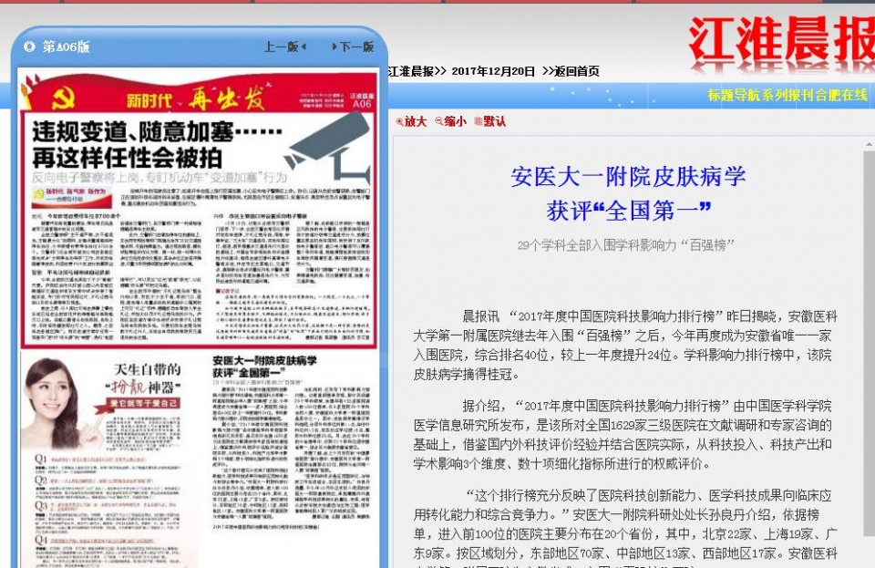 晨报讯 “2017年度中国医院科技影响力排行榜”昨日揭晓,安徽医科大学第一附属医院继去年入围“百强榜”之后,今年再度成为安徽省唯一一家入围医院,综合排名40位,较上一年度提升24位。学科影响力排行榜中,该院皮肤病学摘得桂冠。