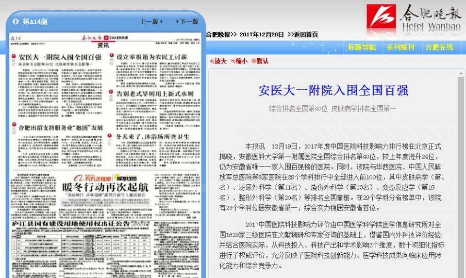 本报讯 12月19日,2017年度中国医院科技影响力排行榜在北京正式揭晓,安徽医科大学第一附属医院全国综合排名第40位,较上年度提升24位,仍为安徽省唯一一家入围百强榜的医院。同时,该院与华西医院、中国人民解放军总医院等8家医院在29个学科排行中全部进入前100位,其中皮肤病学(第1名)、泌尿外科学(第11名)、烧伤外科学(第13名)、变态反应学(第19名)、整形外科学(第20名)等排名全国靠前。在29个学科分省榜单中,该院有23个学科位居安徽省第一,综合实力稳居安徽省首位。
