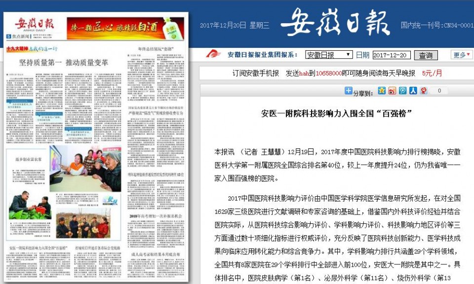 2017中国医院科技影响力评价由中国医学科学院医学信息研究所发起,在对全国1629家三级医院进行文献调研和专家咨询的基础上,借鉴国内外科技评价经验并结合医院实际,从医院科技综合影响力评价、学科影响力评价、科技影响力地区评价等三方面通过数十项细化指标进行权威评价,充分反映了医院科技创新能力、医学科技成果向临床应用转化能力和综合竞争力。其中,学科影响力排行共涵盖29个学科领域,全国共有8家医院在29个学科排行中全部进入前100位,安医大一附院是其中之一。具体排名中,医院皮肤病学(第1名)、泌尿外科学(第11名)、烧伤外科学(第13名)、变态反应学(第19名)、整形外科学(第20名)等排名全国靠前。在29个学科分省榜单中,该院有23个学科位居全省第一,综合实力稳居全省首位。据悉,在上个月发布的中国最佳医院排行榜中,安医大一附院全国排名82位,也是我省唯一入围百强榜的医院。
