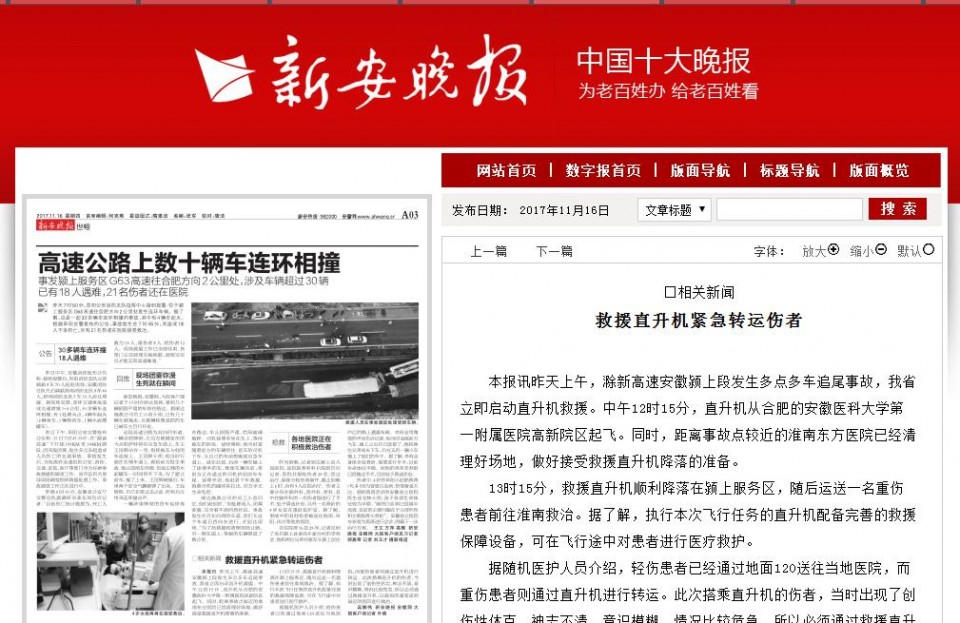 本报讯昨天上午,滁新高速安徽颍上段发生多点多车追尾事故,我省立即启动直升机救援。中午12时15分,直升机从合肥的安徽医科大学第一附属医院高新院区起飞。同时,距离事故点较近的淮南东方医院已经清理好场地,做好接受救援直升机降落的准备。