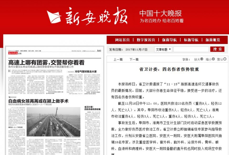 截至11月16日中午12:00,医院共救治23名伤员(重伤9人、轻伤12人、死亡2人)。其中,阜阳市收治重伤5人、轻伤9人、死亡1人;淮南市收治重伤4人、轻伤3人、死亡1人。重伤4人、轻伤3人、死亡1人。