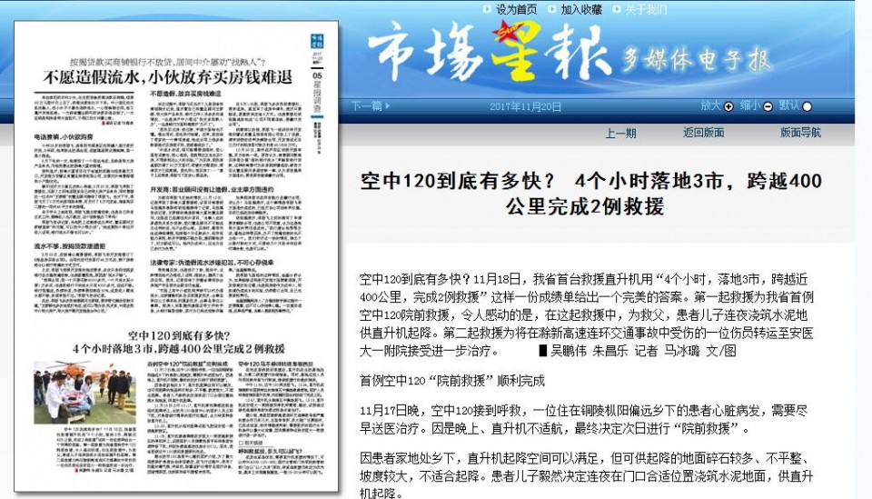 空中120到底有多快?11月18日,我省首台救援直升机用“4个小时,落地3市,跨越近400公里,完成2例救援”这样一份成绩单给出一个完美的答案。第一起救援为我省首例空中120院前救援,令人感动的是,在这起救援中,为救父,患者儿子连夜浇筑水泥地供直升机起降。第二起救援为将在滁新高速连环交通事故中受伤的一位伤员转运至安医大一附院接受进一步治疗。 ▋吴鹏伟 朱昌乐 记者 马冰璐 文/图