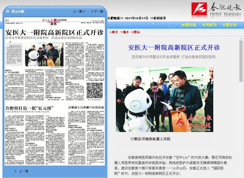 安徽首架医用直升机拉开安徽“空中120”时代的大幕;憨态可掬的机器人导医带来炫酷高科技就医体验;熟练的医护外语服务无障碍保障国外患者;建设安徽首个精子库服务患者……10月16日,安徽正式进入“国际医院”时代,安医大一附院高新院区正式开诊。