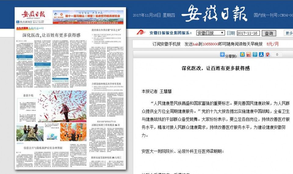 “党中央把人民身体健康作为全面建成小康社会的重要内涵,国家如此重视健康事业,我们深受鼓舞,也深感责任重大。 ”11月6日下午,安医大一附院院长、泌尿外科主任医师梁朝朝刚刚完成一台“达芬奇”机器人肾脏切除手术。 “机器人手术是微创的最高技术,能大大减少传统手术方式对患者身体的伤害程度。”梁朝朝表示,医学是科学,只有不断提高技术水平,才能提高救治病人特别是疑难危重病人的能力,让群众看得起病、看得好病。近几年,安医大一附院加强党建促发展,连续六年入围全国最佳医院百强排行榜,在中国医学科学院排行榜26个学科中,医院24个学科进入全国百强,其中21个位居全省第一,“这完全符合十九大报告提出的 ‘建立优质高效的医疗卫生服务体系’要求,对于未来的发展,我们有信心! ”